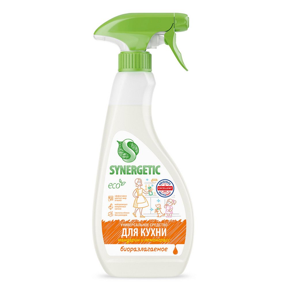 Универсальный чистящий спрей для уборки кухонных поверхностей SYNERGETIC с ароматом "Мандарин и лемонграсс" быстро и эффективно удаляет все виды кухонных загрязнений, жир и налет, устраняет неприятные запахи. Средство легко смывается водой и подходит для уборки любых кухонных поверхностей и техники: раковины, мойки, столешницы, кухонной плиты (включая стеклокерамическую), холодильника, микроволновой печи, фартука из керамической плитки, противней и других. Спрей является гипоаллергенным, не содержит хлора, фосфатов, красителей, SLS, SLES, ПЭГ, агрессивных ПАВ и безопасен для использования на поверхностях, контактирующих с едой. Благодаря биоразлагаемым компонентам в составе средство не вредит микрофлоре септических установок. Дерматологически протестировано независимым институтом Dermatest® в Германии.