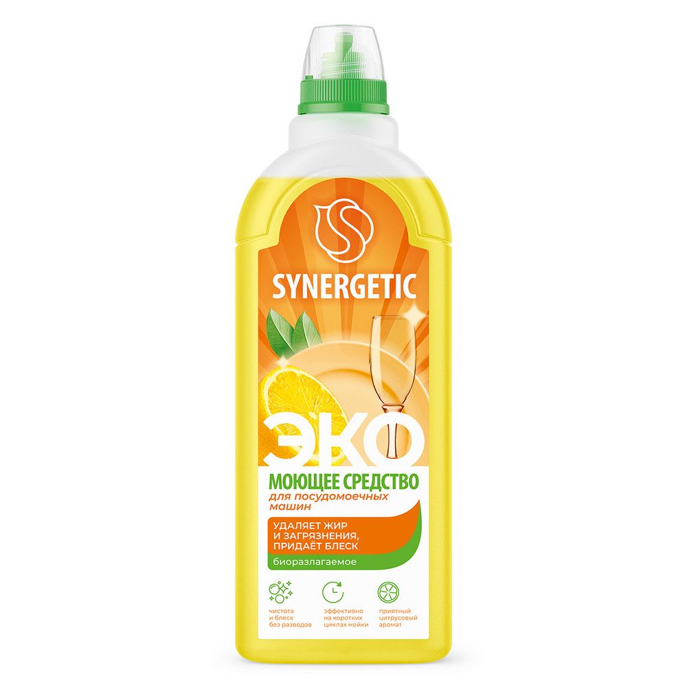 Биоразлагаемое концентрированное средство для посудомоечных машин SYNERGETIC - универсальное средство для мытья посуды, столовых приборов и кухонного инвентаря в посудомоечных машинах любого типа. Оно эффективно даже на коротких циклах мойки. Средство полностью смывается водой и подходит для мытья детской посуды. Комплекс растительных Н-тензидов и соды удаляет сложные загрязнения, растворяет жир, качественно и бережно очищает посуду и столовые приборы. Специальные добавки защищают машину от накипи, предотвращают повторное оседание загрязнений, придают блеск, не оставляют разводов и известкового налета на поверхности посуды. Гипоаллергенная парфюмерная композиция на основе натуральных эфирных масел лимона, лемонграсса и лайма придает средству приятный цитрусовый аромат. Пищевой краситель в низких концентрациях придает гелю нежно-желтый цвет. Биоразлагаемые компоненты не вредят микрофлоре септических установок. Попадая в среду септика, средство «понятно» для микроорганизмов и без труда распадается на простые соединения.