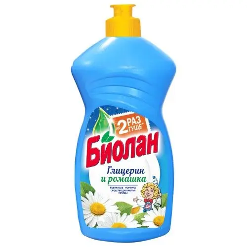 Моющее средство для посуды Биолан эффективно удаляет жир, хорошо пенится и легко смывается водой, не оставляя разводов и придавая посуде блеск.