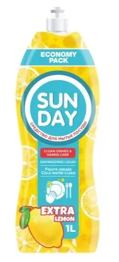 SUNDAY Экстра Лимон универсальное средство для мытья посуды любого вида. Бодрящий яркий аромат лимона придаст энергии и нейтрализует неприятные запахи. Большая экономичная упаковка 1л позволяет уменьшить потребление пластика и минимизировать экологический след.