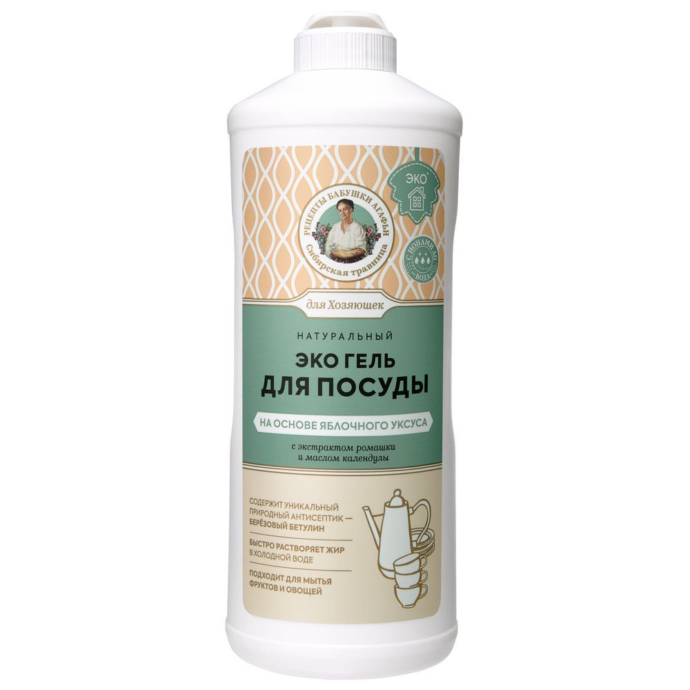 Натуральный эко гель для мытья посуды на основе яблочного уксуса сварен с душой и заботой по рецептам Агафьи Тихоновны Ермаковой. Он содержит натуральные компоненты, эффективность которых проверена столетиями.