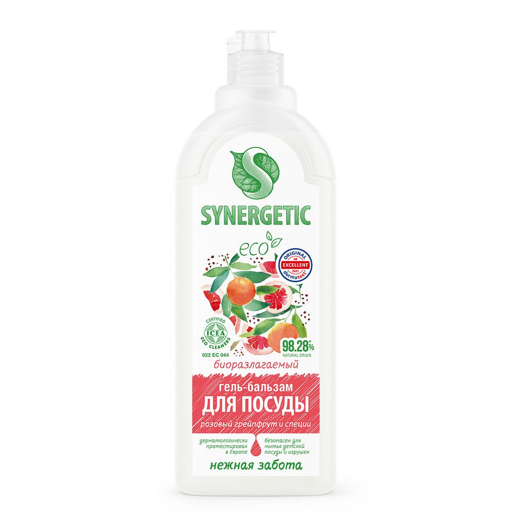 Биоразлагаемый гель-бальзам для мытья посуды и детских игрушек SYNERGETIC "Розовый грейпфрут и специи" - это экологичное, безопасное и эффективное средство для мытья всех видов посуды, в том числе детской, кухонного инвентаря и детских игрушек от любых видов загрязнений. Он легко смывается водой и не оставляет следов на посуде. Комплекс биоразлагаемых ПАВ из растительного масла и энзимов эффективно удаляет жир, сложные загрязнения и запахи даже в холодной воде, придавая посуде зеркальный блеск. Ухаживающие компоненты в составе средства нежно заботятся о коже рук, оказывают успокаивающее и смягчающее действие. Глицерин на растительной основе защищает кожу рук от сухости и раздражения. Экстракты ламинарии и спирулины питают и увлажняют кожу рук, делая ее более мягкой, повышая эластичность. Биолипиды и софоролипид растительного происхождения сохраняют естественный микробиом, поддерживают барьерные и регенерирующие функции кожи. Гипоаллергенная парфюмерная композиция с эфирными маслами эвкалипта и апельсина придает средству нежный и приятный аромат.