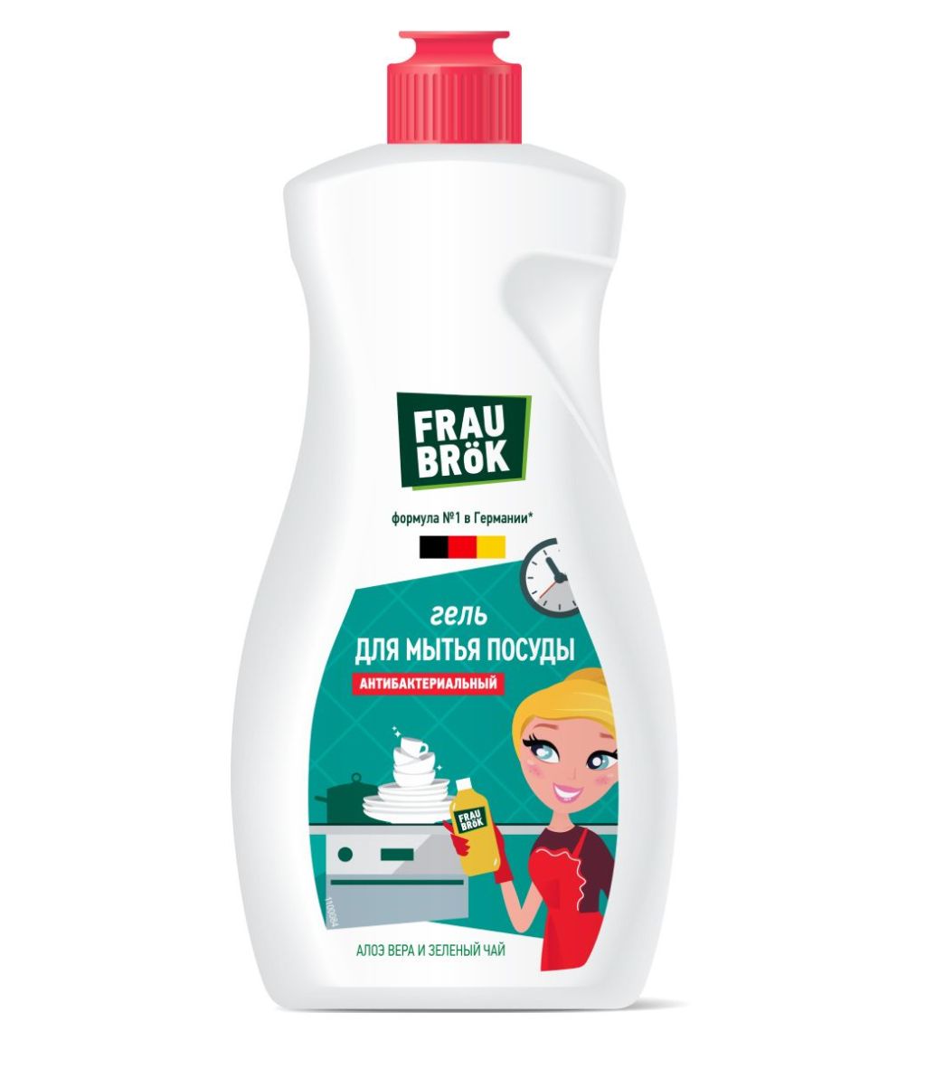 Привет, я – фрау Брок! И я в уборке знаю толк.<br> Страдать из-за грязной посуды? Вот еще! Лучше используй гель для мытья посуды алоэ вера и зеленый чай – ведь с ним она начнет блестеть всего за пару минут. Безопасная* рецептура средства с добавлением эффективных немецких компонентов образует воздушную, нежную пену, которая обеспечит спа-уход твоей посуде и в два счета отмоет жир и стойкие загрязнения, оставив после себя лишь кристальную чистоту и свежесть. А экстракты алоэ вера и зеленого чая в геле подарят коже рук мягкость и гладкость, предотвращая ее сухость, даже если ты привыкла наводить красоту без перчаток.<br> FRAU BRÖK - и уборка в удовольствие!