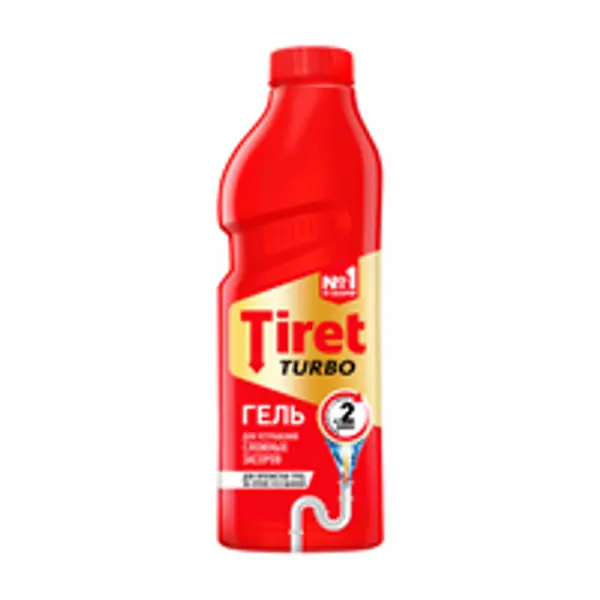 Возник засор? Попробуйте линейку от эксперта No1 в удалении засоров Tiret Turbo. Продукт эффективно и быстро справляется даже со сложными засорами, начиная действовать от 2 минут. Tiret Turbo безопасен для большинства видов труб, идеально подходит для очищения труб в ванной комнате и кухне. Благодаря своей густой формуле гель проникает в трубы даже в стоячей воде, удаляя засоры различной природы, такие как: жир, остатки пищи, мыльный налет, волосы и т.д.
