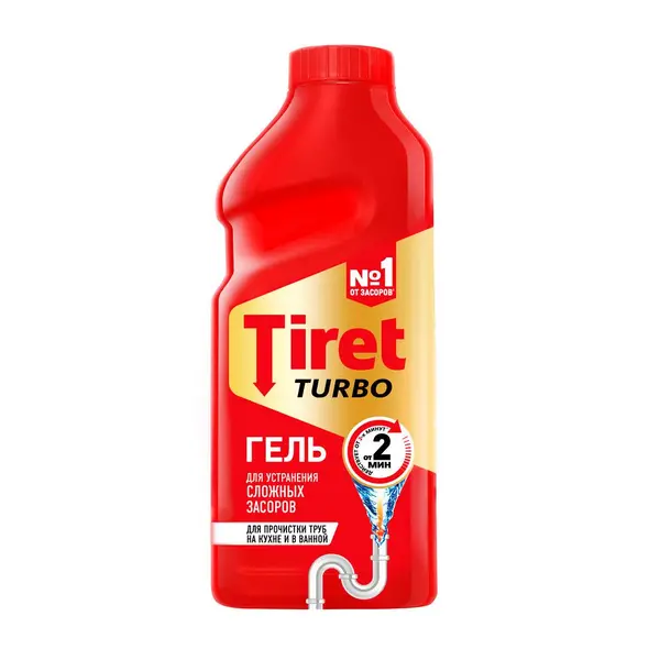 Возник засор? Попробуйте линейку от эксперта No1 в удалении засоров Tiret Turbo. Продукт эффективно и быстро справляется даже со сложными засорами, начиная действовать от 2 минут. Tiret Turbo безопасен для большинства видов труб, идеально подходит для очищения труб в ванной комнате и кухне. Благодаря своей густой формуле гель проникает в трубы даже в стоячей воде, удаляя засоры различной природы, такие как: жир, остатки пищи, мыльный налет, волосы и т.д.