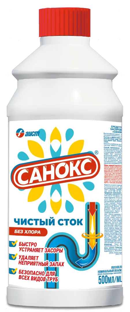"Санокс"- чистый сток - высокоэффективное гелеобразное средство для устранения засоров и неприятных запахов в сливных стоках.