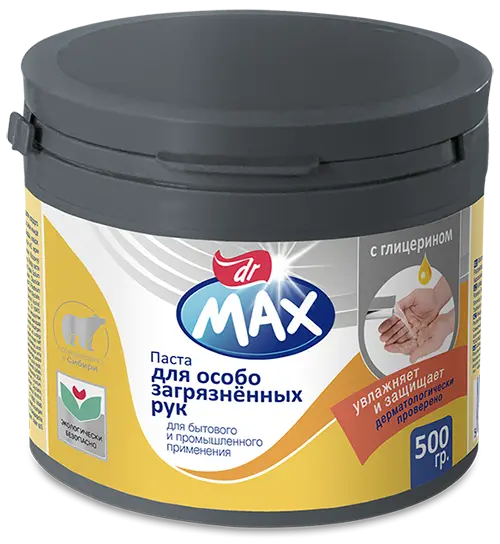 Cостав пасты dr Max идеально подходит для очищения кожи рук от загрязнений, причиной которых стали смазки, масла, ржавчина, красители и пр.