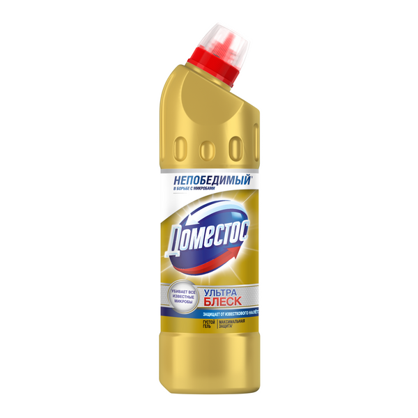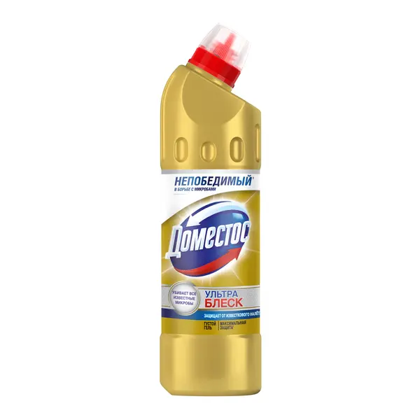Чистящий гель Domestos Ультра блеск 0,5 литра помогает обеспечивать блестящую чистоту и защиту от микробов надолго. Доместос Ультра Блеск — это густое и экономичное средство, которое имеет гелевую текстуру и помогает устранять неприятные запахи, бактерии, грибки, вирусы и споры. Чистящий Доместос гель Ультра Блеск можно купить и использовать для уборки и очищения туалета. Чистящий гель Domestos Ультра блеск: -эффективно очищает грязь и борется с неприятными запахами; -помогает предотвращать появление известкового налета; -борется с бактериями, плесенью, грибками, вирусами и спорами; -имеет удобный изогнутый дозатор и гелевую текстуру для экономичного расхода. Средство для уборки Domestos Ультра блеск оснащен специальном колпачком от открывания детьми. Чтобы открыть, надавите на уплотнения по бокам колпачка и поверните против часовой стрелки. Чтобы закрыть, поверните колпачок по часовой стрелке до щелчка. Инструкция по применению Доместос гель Ультра Блеск в неразбавленном виде: для унитаза — нанесите под ободок, оставьте на продолжительное время или на ночь, смойте водой.