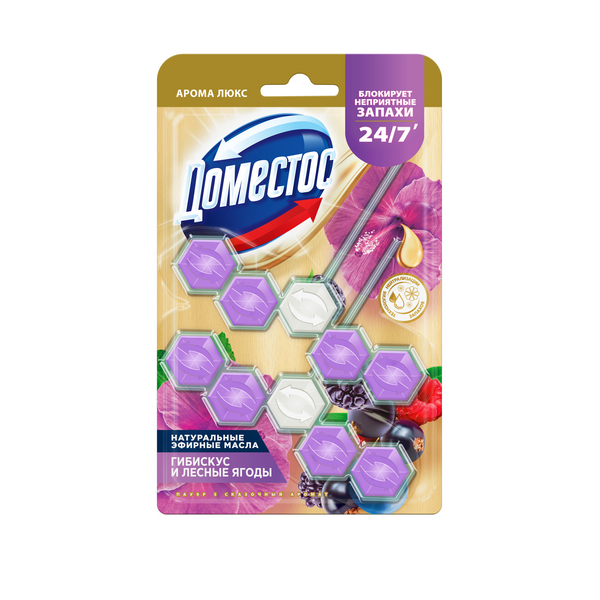 Арома-блок для очищения туалета Domestos Aroma Lux Duo Сказочный аромат блокировка неприятного запаха — это пять преимуществ, помогающих обеспечить блокировку неприятных запахов 24/7', защиту от загрязнений и микробов и сохранить чистоту и блеск. При каждом смывании появляется свежий аромат пряного гибискуса и сочных лесных ягод на срок 24 часов' и обильная пена, которая борется с налетом, поддерживая гигиену и блеск поверхности унитаза. С новыми ароматами от Domestos можно наслаждаться приятными и яркими ароматами цветов, фруктов и ягод не выходя из дома.Блок Доместос для унитаза содержит активное вещество, которое под действием напора воды ополаскивает всю поверхность унитаза, защищая от бактерий и помогая предотвращать известковый налет.Блок для туалета Domestos Aroma Lux Duo Сказочный аромат:-блокировка неприятных запахов 24/7'-защита от микробов 24/7 ''-предотвращает известковый налет;-удаляет грязь обильной пеной;-оставляет блеск и яркий долгий аромат после смывания;-содержит арома масла-содержит 2 блока в упаковке;-работает до 1,5 раз дольше*.