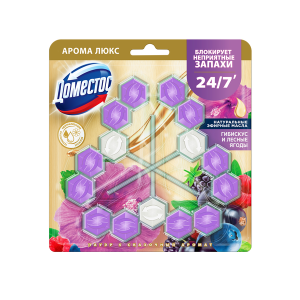 Domestos Aroma Lux Trio — туалетный блок для унитаза с ароматом сочных лесных ягод и пряного гибискуса. Освежитель для унитаза борется с неприятными запахами, защищает от загрязнений и микробов, помогает поддерживать гигиену и опрятный вид ванной комнаты. Блок «Антиналет» для сантехники Domestos содержит активное вещество, которое под напором воды превращается в обильную пену и ополаскивает всю поверхность унитаза. Результат: блеск, чистота и длительная свежесть. Шарики для унитаза Domestos Aroma Lux Trio: Блокируют неприятные запахи 24/7'; Оставляют долгий аромат благодаря натуральным эфирным маслам'; Обеспечивают гигиену и защиту от микробов'; Предотвращают появление известкового налета'; Работают до 1,5 раза дольше''. Таблетки для унитаза представлены в выгодном формате — по 3 блока в упаковке. Чтобы вы каждый день наслаждались свежестью и забыли о ежедневной уборке сантехники.