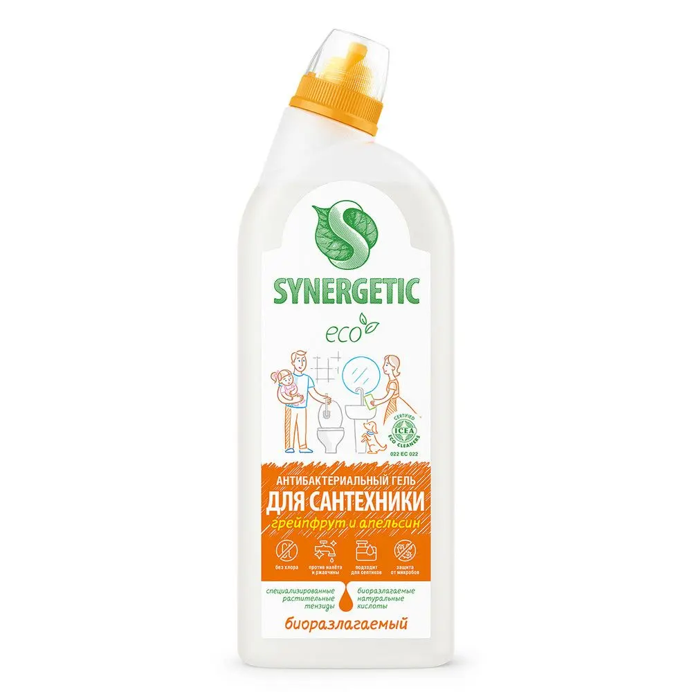Биоразлагаемое антибактериальное средство для сантехники SYNERGETIC "Грейпфрут и апельсин" - концентрированное чистящее средство для ежедневной уборки поверхностей, устойчивых к кислотным моющим средствам, в ванных комнатах и санузлах: унитаза, раковины, ванны, душевой кабины, керамической плитки, акриловых, фаянсовых и эмалированных поверхностей. Комплекс натуральных кислот (лимонной, гликолевой и молочной) и Н-тензидов, полученных из растительного масла, устраняет известковый налёт, ржавчину, камень и минеральные загрязнения даже в холодной и жесткой воде. Средство с антибактериальным эффектом убивает микробы и бактерии, а также эффективно устраняет неприятные запахи. Гипоаллергенная парфюмерная композиция с маслами грейпфрута, апельсина, померанца и мандарина оставляет свежий аромат. Международный экологический сертификат ICEA подтверждает биоразлагаемость, безопасность и эффективность средства. Средство полностью смывается водой, не содержит хлор, фосфаты, оптические отбеливатели, SLS, SLES, агрессивные кислоты и ПАВ. Биоразлагаемые компоненты не вредят микрофлоре септических установок.