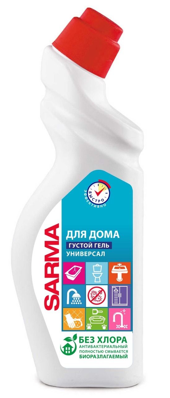 Чистящий гель для сантехники "САРМА" иоразлагаемое средство. Убивает микробов, оставляя поверхность идеально чистой. Дезинфицирует без хлора. Легко наносится под ободок унитаза. Благодаря густой формуле равномерно распределяется, не стекает на дно и работает даже под водой. Удаляет ржавчину, известковые отложения, мочевой камень и остатки моющих средств. Подходит для чистки по всему дому, для керамических, кафельных, фаянсовых, эмалированных, нержавеющих поверхностей. В разбавленном виде подходит для мытья поверхностей в ванной комнате и туалете, а также для чистки лотков домашних животных.