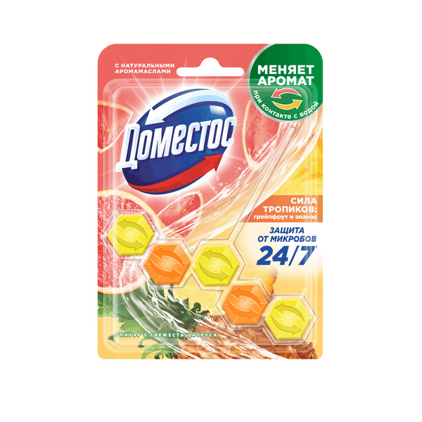 Доместос шарики для унитаза Сила тропиков — это эффективное решение для поддержания чистоты и свежести в вашем туалете. Уникальный сменный блок-ароматизатор наполняет туалетную комнату ароматом свежего грейпфрута, а при смывании – запахом соочного тропического ананаса. Подвесной блок для унитаза нейтрализует неприятные запахи 24 часа в сутки, 7 дней в неделю, обеспечивая комфорт и гигиену. Преимущества: - Смена аромата при контакте с водой: запах соческого грейпфрута меняется на тропический ананас - Нейтрализация запахов 24 в час - Эффективное очищение и защита от микробов - Сохраняет блеск блеска - Антиналетные таблетки для туалета Domestos Сила тропиков помогают вам предотвратить образование и известкового налета. Обильная пена, образующаяся при использовании средства, обеспечивает эффективное очищение и сохранение блеска кожи. В состав шариков Сила тропиков входят ингредиенты аромамасла, которые не только освежают воздух, но и обеспечивают защиту от микробов. Это позволяет предотвратить их размножение, что важно для поддержания гигиены туалетной комнаты.