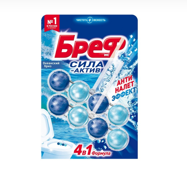 Средство для унитаза Бреф Сила-Актив с антиналет эффектом – подвесной туалетный блок с формулой 4в1 против известкового налета и загрязнений. Активная формула блока для унитаза Бреф работает в 4 направлениях: • образует очищающую пену, которая обеспечивает чистоту унитаза; • предотвращает образование известкового налета; • помогает предотвратить повторное загрязнение; • придает туалетной комнате свежий аромат после каждого смывания.