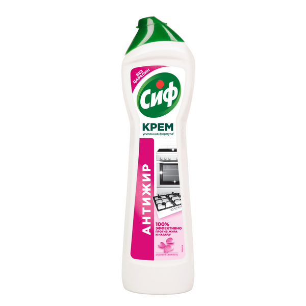 Чистящий крем Cif Розовая свежесть Антижир создан для борьбы с любыми загрязнениями на кухне. Он эффективно и быстро удаляет брызги масла, пригоревший жир и остатки пищи, оставляя после себя идеальную чистоту' и легкий, свежий аромат. Усиленная формула'' с натуральными микрокристаллами легко растворяет загрязнения, обеспечивает гладкость и блеск без царапин даже на деликатных поверхностях. Можно использовать для стеклокерамики, хромированных элементов и поверхностей, контактирующих с пищей, а также для любых других рабочих зон на вашей кухне. Cif Розовая Свежесть — ваш персональный эксперт по уборке на кухне — регулярной или генеральной. Нанесите чистящий крем на загрязненную поверхность при помощи губки или непосредственно из флакона, подождите 1-2 минуты: за это время средство растворит самые стойкие загрязнения. Затем протрите поверхность абразивной стороной губки, чтобы активировать формулу с микрокристаллами, и смойте остатки крема водой. Вместе с кремом Cif уборка требует меньше усилий — а значит, у вас всегда найдется время для чего-то действительно важного! Чистящий крем для кухни расходуется экономично за счет своей густой текстуры, одного флакона хватит на много уборок, ведь чистота и уют в вашем доме не должны заканчиваться быстро. Легкий цветочный аромат станет свежим штрихом к атмосфере. Розовый крем Сиф безопасен для большинства твердых поверхностей.