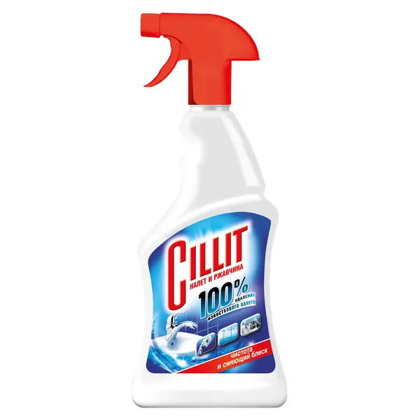 Средство Cillit предназначено для удаления известкового налета и ржавчины с хромированных поверхностей, плитки, фарфора, стекла, пластика, изделий из нержавеющей стали. Придает поверхности блеск в ванной и обеспечивает чистоту до 5 дней.