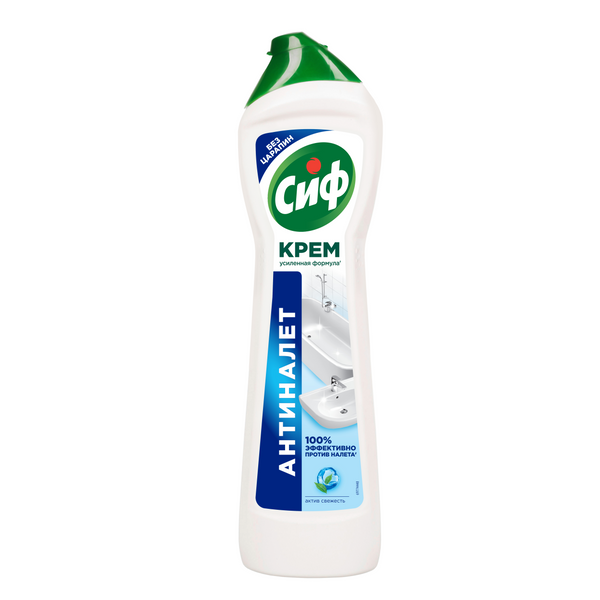 Чистящий крем для ванны Cif Антиналет — ваш личный помощник по уборке в ванной комнате. Он знает, как удалить даже самые стойкие загрязнения, в том числе известковый и мыльный налет, а также ржавчину. То, что нужно, чтобы быстро привести в порядок сантехнику, стереть разводы на кафеле, вернуть блеск хромированным элементам и эмали. Его усиленная формула' с натуральными микрокристаллами легко удаляет 100% налета'' и других стойких загрязнений. Для эффективной и быстрой уборки ванной комнаты нанесите чистящий крем Cif Антиналет на поверхность при помощи губки или прямо из флакона. Подождите 1-2 минуты: за это время усиленная формула крема растворит загрязнение, проникая в его структуру. Потрите поверхность абразивной стороной губки, чтобы активировать микрокристаллы в составе и удалить загрязнение без следа. Густая текстура крема равномерно распределяется и обеспечивает экономичный расход средства. Ваш комфорт во время уборки — важная часть нашей работы. Формула Cif без резкого запаха безопасна не только для поверхностей, на которых используется, но и для человека. Мы знаем, как это важно для тех, кто заботится заботится о красоте дома и здоровье семьи. Сиф Актив Фреш позаботится о том, чтобы поверхности в вашей ванной комнате сияли чистотой. Используйте его для акрила, металла (в том числе хромированного), стекла, эмалей и керамики. Мягкий чистящий крем с натуральной чистящей основой''' не оставляет царапин даже на самых деликатных поверхностях.