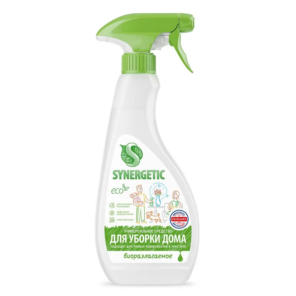 Универсальный биоразлагаемый спрей для уборки SYNERGETIC - это многофункциональное чистящее средство, которое быстро и легко удаляет любые виды бытовых загрязнений: грязь, масложировые пятна, пыль, налет. Эффективно устраняет неприятные запахи и обезжиривает поверхность, защищая ее от повторного загрязнения. Спрей подходит для любых видов поверхностей: напольных (ламината, линолеума, паркета), глянцевых и лакированных, эмалированных и деревянных, пластика, керамики, хрома, нержавеющей стали, текстиля (ковров, обивки мягкой мебели и других), кафельной плитки. Легко смывается, не оставляя разводов, и придает блеск. Средство является гипоаллергенным и полностью состоит из биоразлагаемых компонентов, которые не вредят микрофлоре септических установок. Дерматологически протестировано независимым институтом Dermatest® в Германии.