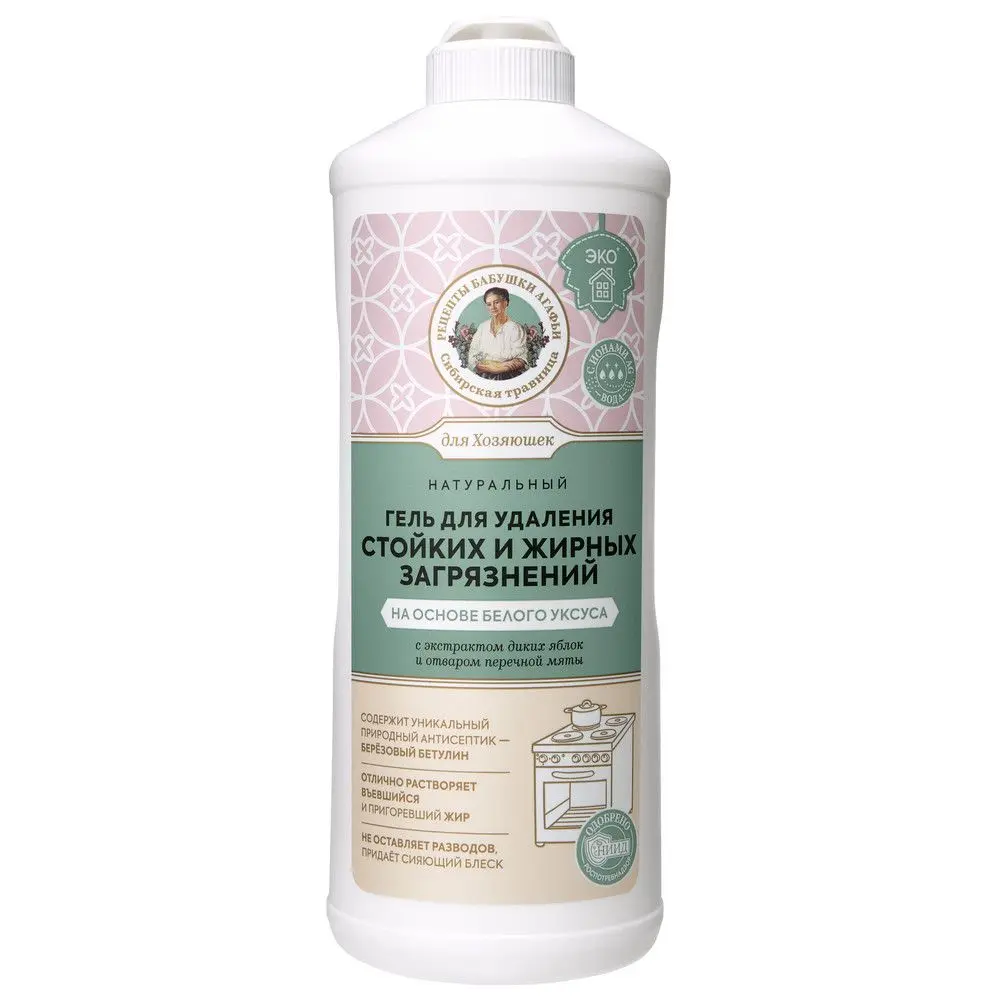 Натуральный гель на основе белого уксуса сварен с душой и заботой по рецептам Агафьи Тихоновны Ермаковой. Он содержит натуральные компоненты, эффективность которых проверена столетиями. Эффективно удаляет стойкие загрязнения и пригоревший жир с любых видов кухонных плит, духовых шкафов, грилей, противней и других кухонных изделий.