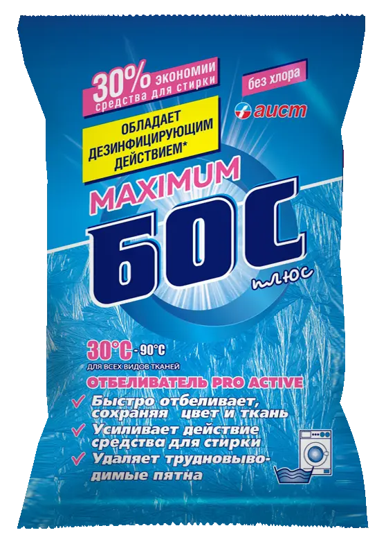 Усиленная формула средства «БОС» - плюс maximum с максимальным содержанием активного кислорода специально разработана для отбеливания без кипячения всех видов тканей, включая шерсть и шёлк, при низких температурах (30°С-50ºС).