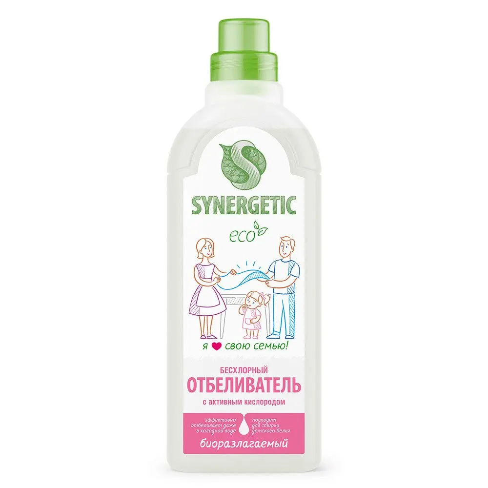 Универсальный биоразлагаемый отбеливатель для белья SYNERGETIC – бесхлорное средство с активным кислородом для отбеливания и сохранения белизны всех видов тканей. Эффективен даже в холодной воде. Отбеливатель подходит для использования в качестве добавки к моющему средству для ручной или машинной стирки или для предварительного замачивания вещей со сложными загрязнениями и въевшимися пятнами. Не повреждает волокна тканей и сохраняет яркость белья. Экологичный и безопасный отбеливатель полностью выполаскивается из волокон ткани и не остается на одежде. Средство безопасно на природы и человека, подходит для стирки детского белья 0+ и одежды людей с чувствительной кожей. Концентрат создан из растительных компонентов: уникального комплекса растительных Н-тензидов и активного кислорода. Он не содержит хлора, ароматизаторов, красителей, фосфатов, агрессивных ПАВ. Биоразлагаемый отбеливатель безопасен для септических установок: попадая в среду септика, средство «понятно» для микроорганизмов и без труда распадается на простые соединения.