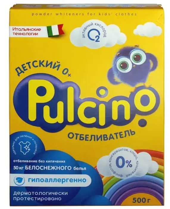 Детский отбеливатель Pulcino. В упаковке: 1 шт (500 г) или 2 шт (1000 г). Cодержит активный кислород, который позволяет достигать выраженного отбеливания без кипячения. Подтверждённая безопасность: продукция прошла дерматологический контроль и рекомендована для стирки одежды людей с чувствительной кожей и детей с рождения (0+). Не содержит хлора, красителей, парабенов, фосфатов. В основе этого средства лежат мягкие эффективные моющие компоненты, которые очищают ткань, не повреждая волокон. Оптимальный режим использования 60 °С. Подходит для всех видов тканей, кроме шерсти и шелка. Идеально для пеленок и ползунков. Концентрированная формула позволяет существенно экономить семейный бюджет на стирку (одной пачки хватит на 50 кг белья). Гипоаллергенность продукта подтверждена. Назначение: для усиления действия средств для стирки и отбеливания изделий из различных видов тканей, кроме шерсти, шелка и кожи.
