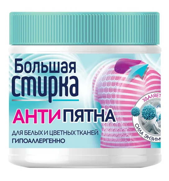 Пятновыводитель "Большая стирка" - средство без хлора, на основе активного кислорода. Удаляет сложные загрязнения и пятна