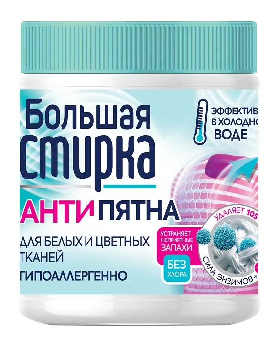 Пятновыводитель "Большая стирка" - средство без хлора, на основе активного кислорода.• Удаляет сложные загрязнения и пятна