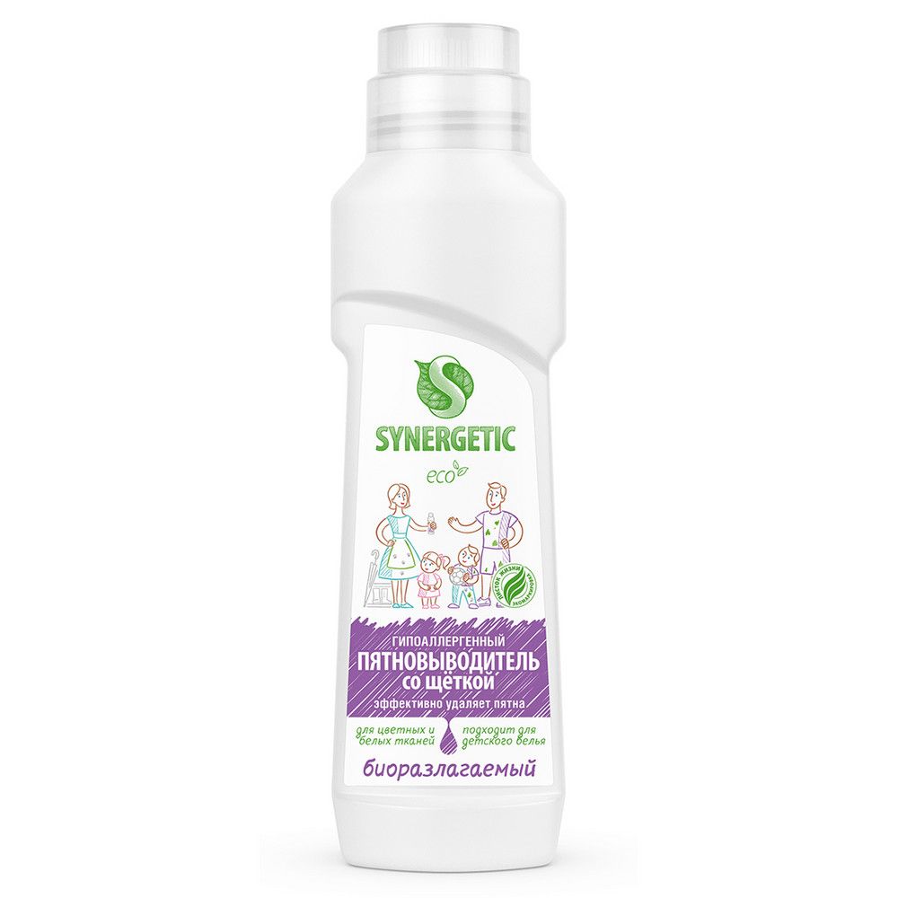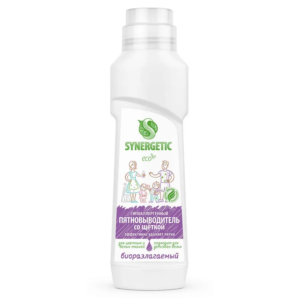 Биоразлагаемый гипоаллергенный пятновыводитель для предварительной обработки пятен SYNERGETIC - универсальное средство для эффективного удаления загрязнений и трудновыводимых пятен с тканей. Комбинация пяти видов энзимов (протеаза, амилаза, липаза, маннаназа, целлюлаза) и растительных ПАВ эффективно удаляет въевшиеся загрязнения и застарелые пятна от масла, жира, какао, ягод, травы, чернил, кофе, вина, крови на белом и цветном белье из натуральных и синтетических тканей. Гипоаллергенный пятновыводитель подходит для детского белья 0+ и одежды людей с чувствительной кожей, а также для деликатных тканей. Средство полностью выполаскивается из волокон и не остается на одежде. Не содержит красителей и ароматизаторов. Биоразлагаемый пятновыводитель безопасен для септических установок. Попадая в среду септика, средство «понятно» для микроорганизмов и без труда распадается на простые соединения. Гипоаллергенный пятновыводитель имеет экомаркировку "Листок жизни". Этот знак на упаковке - гарантия экологической безопасности продукта для человека и окружающей среды. Небольшой флакон с щеточкой очень экономичен, удобен при использовании и идеально подходит для предварительной обработки пятен.