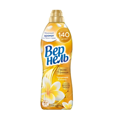 Концентрированный кондиционер для белья Вернель Ароматерапия Чарующая ваниль подарит Вашему белью не только невероятную мягкость, но и магический аромат сладких цветков ванили, а благодаря специальным аромакапсулам в составе кондиционер для стирки Вернель позволит наслаждаться интенсивным ароматом белья до 140 дней.