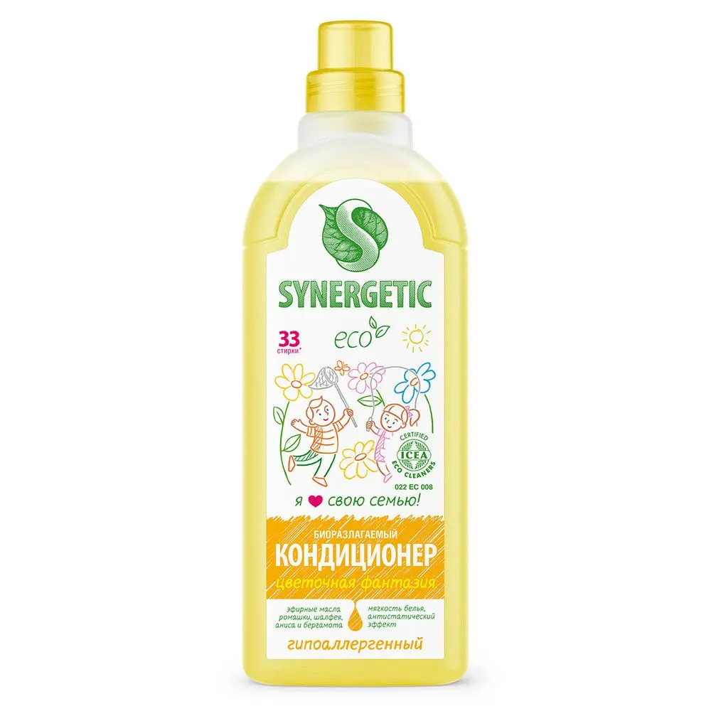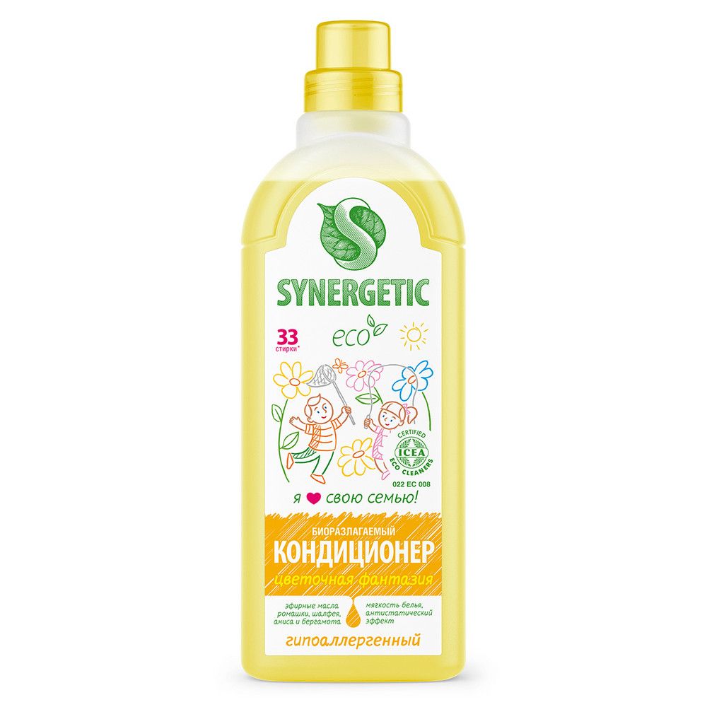 Биоразлагаемый кондиционер-ополаскиватель для белья SYNERGETIC "Цветочная фантазия" – высокоэффективное средство, бережно ухаживающее за всеми типами ткани, в том числе деликатными, и придающее особую мягкость и нежность белью после стирки. Гипоаллергенный кондиционер-ополаскиватель нейтрализует остатки средств для стирки на ткани, помогает сохранить структуру ткани, защищая волокна от изнашивания и повреждения. Средство обладает антистатическим эффектом. Комплекс растительных К-тензидов обеспечивает легкую глажку белья после стирки и высыхания. Гипоаллергенная парфюмерная композиция с эфирными маслами ромашки, шалфея, аниса и бергамота придает белью свежий цветочный аромат. Подходит для ручной и машинной стирки, полностью выполаскивается из тканей. Международный экологический сертификат ICEA подтверждает биоразлагаемость, безопасность и эффективность средства. Биоразлагаемые компоненты не вредят микрофлоре септических установок.