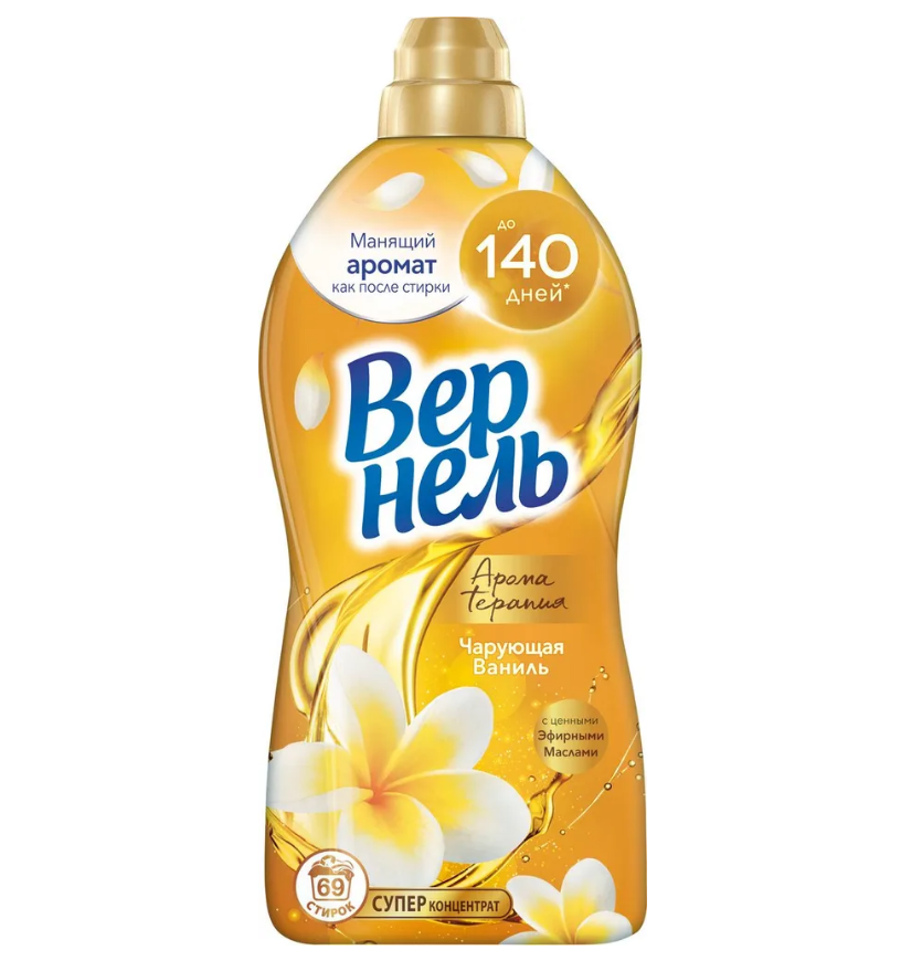 Концентрированный кондиционер для белья Вернель Ароматерапия Чарующая ваниль подарит Вашему белью не только невероятную мягкость, но и магический аромат сладких цветков ванили, а благодаря специальным аромакапсулам в составе кондиционер для стирки Вернель позволит наслаждаться интенсивным ароматом белья до 140 дней.