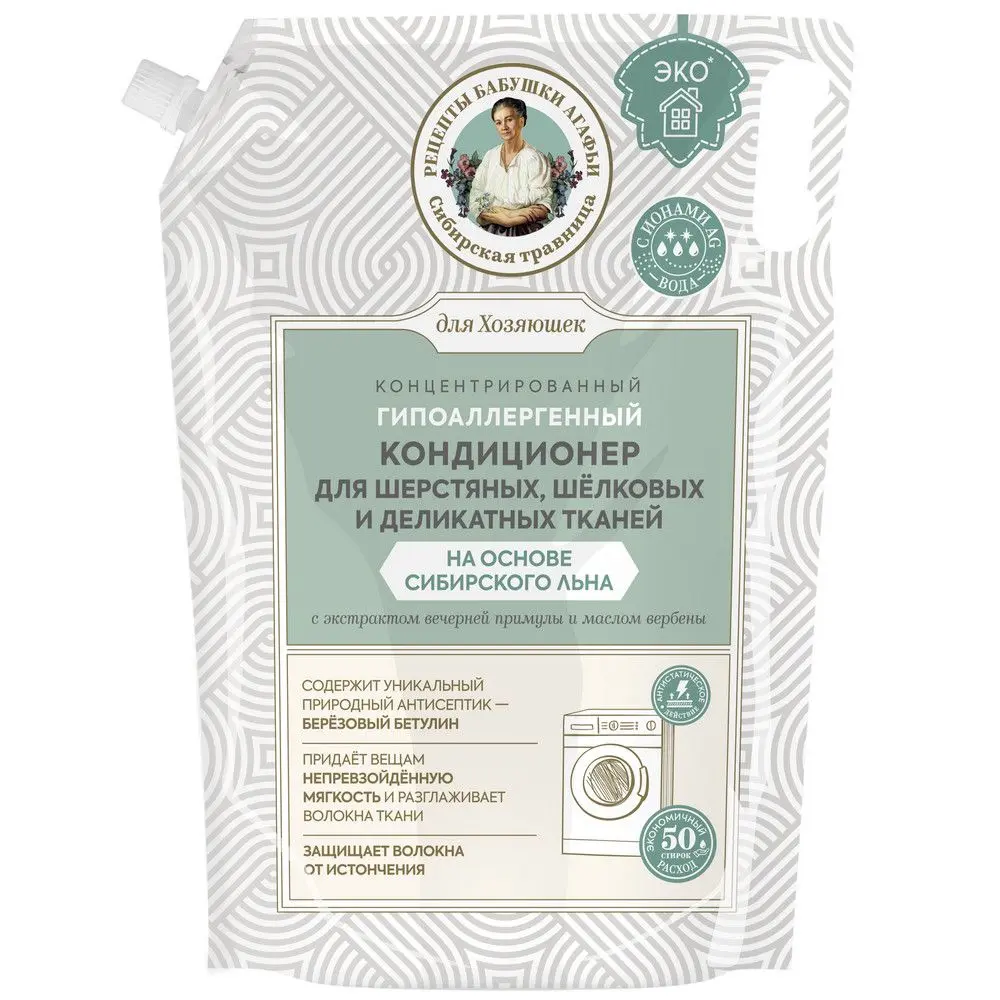 Концентрированный гипоаллергенный кондиционер для шерстяных, шёлковых и деликатных тканей на основе масла сибирского льна сварен с душой и заботой по рецептам Агафьи Тихоновны Ермаковой. Натуральные активные компоненты проникают глубоко в структуру тканей, защищая их от выцветания и преждевременного износа. Он бережно ухаживает, смягчает и дарит вещам приятный аромат, облегчает процесс утюжения и уменьшает возникновение статического электричества.