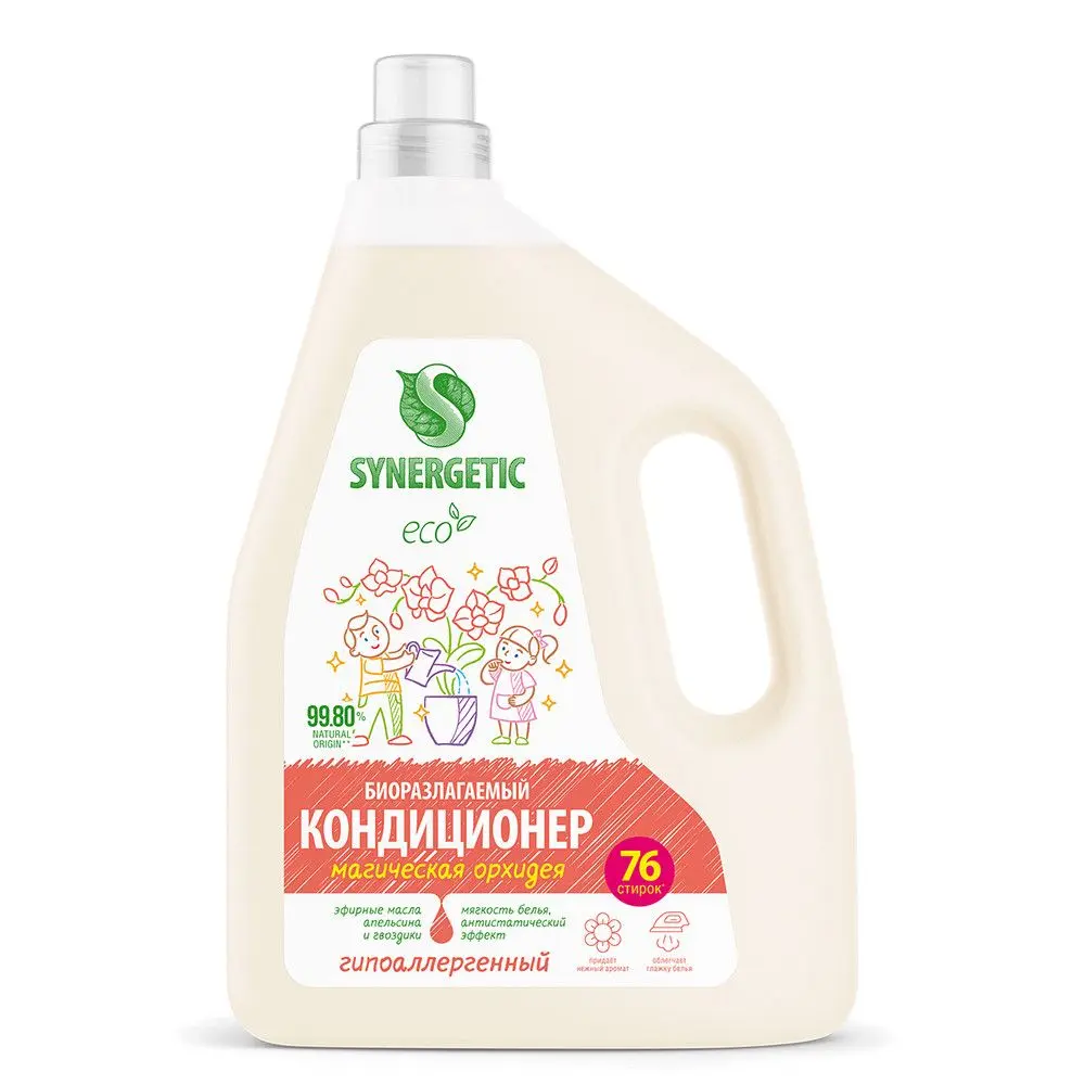 Биоразлагаемый кондиционер-ополаскиватель для белья SYNERGETIC "Магическая орхидея" – высокоэффективное средство, бережно ухаживающее за всеми типами ткани, в том числе деликатными, и придающее особую мягкость и нежность белью после стирки. Гипоаллергенный кондиционер-ополаскиватель нейтрализует остатки средств для стирки на ткани, помогает сохранить структуру ткани, защищая волокна от изнашивания и повреждения. Средство обладает антистатическим эффектом. Комплекс растительных К-тензидов обеспечивает легкую глажку белья после стирки и высыхания. Гипоаллергенная парфюмерная композиция с эфирными маслами апельсина и гвоздики придает белью нежный и приятный аромат. Подходит для ручной и машинной стирки, полностью выполаскивается из тканей. Биоразлагаемые компоненты не вредят микрофлоре септических установок.