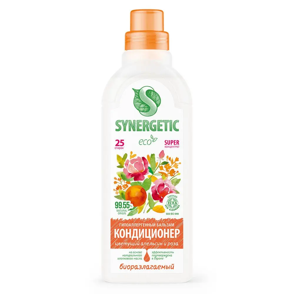 Биоразлагаемый концентрированный гипоаллергенный бальзам-кондиционер для белья SYNERGETIC с нежным ароматом "Цветущий апельсин и роза" на основе масла хлопка придает белью мягкость и способствует его быстрому высыханию после стирки. Средство нейтрализует остатки средств для стирки на ткани, помогает сохранить структуру ткани, защищая волокна от изнашивания и повреждения. Подходит для ручной и машинной стирки, для всех типов ткани, в том числе деликатных, таких как шерсть и шелк. Средство обладает антистатическим эффектом, а содержащийся в нем комплекс растительных К-тензидов обеспечивает легкую глажку одежды. Благодаря современному инновационному компоненту - целлюлазе - бальзам-кондиционер помогает сохранить первоначальный вид белья, препятствует появлению катышков и ворсинок, а также разрушению структуры ткани, возвращая яркость цветам и гладкость волокнам. Растительный биолипид в составе кондиционера снижает риск возникновения раздражения кожи и способствует восстановлению ее липидного слоя. Бальзам-кондиционер подходит для стирки детского белья 0+ и одежды людей с чувствительной кожей.