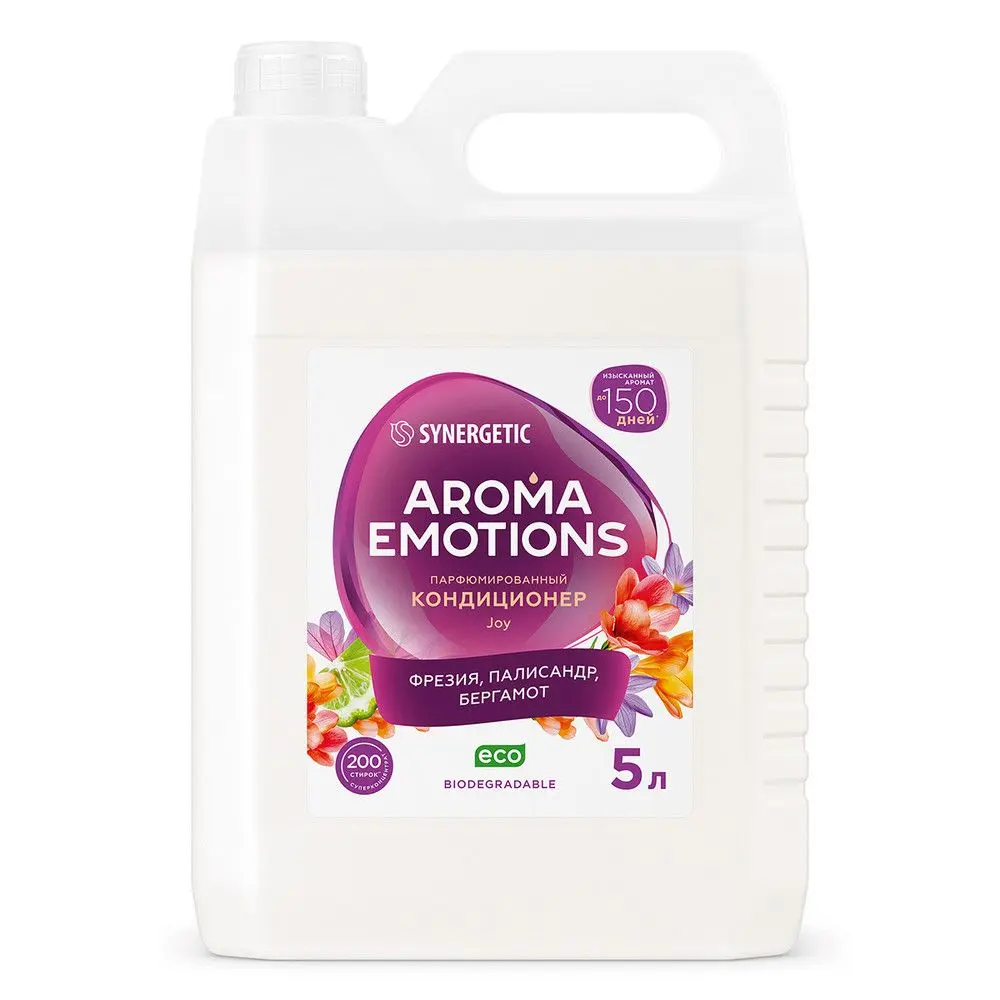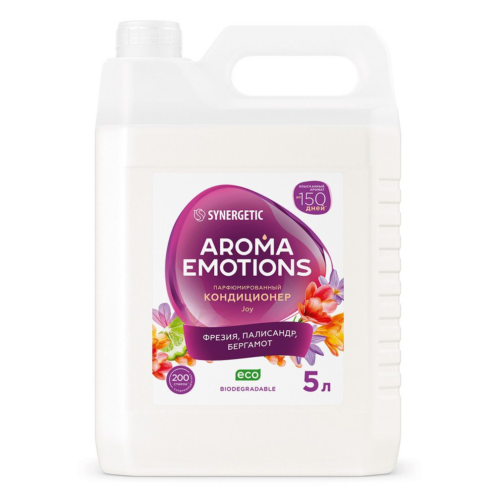 Биоразлагаемый кондиционер для белья SYNERGETIC "EMOTIONS" Joy / Радость – это не просто средство для ухода за тканью, это путешествие в мир ароматов, возможность выразить свою индивидуальность и добавить немного роскоши в повседневную жизнь. Кондиционер бережно ухаживает за всеми типами ткани, придаёт мягкость белью после стирки, обеспечивает лёгкую глажку. Обладает антистатическим эффектом. Суперконцентрированная формула обеспечивает экономичный расход средства. Биоэнзим целлюлаза препятствует появлению катышков и ворсинок, сохраняет первоначальный внешний вид и цвет ткани даже после многократных стирок, не разрушая её структуру. Растительный биолипид в составе кондиционера снижает риск возникновения раздражения кожи и способствует восстановлению её липидного слоя. Парфюмерная композиция Joy открывается освежающими нотами сочного бергамота, которые плавно переходят в нежные аккорды фрезии с лёгкими фруктовыми нюансами. В сердце аромата — ноты зелёного чая, которые дарят травянистую прохладу и ощущение чистоты. Палисандр добавляет тёплые древесные оттенки, а жасмин привносит элегантную цветочную сладость, создавая гармоничное сочетание свежести и утончённости. Завершают композицию мягкие мускусно-амбровые оттенки. Аромат представляет собой баланс между свежестью и теплотой, гармонией и элегантностью. Удивительно бодрящий и радостный аромат со свежими фруктовыми оттенками завораживает и улучшает настроение, оставляя на ткани приятный шлейф до 150 дней при хранении белья благодаря инкапсулированной парфюмерной композиции. Кондиционер подходит для стирки всех типов тканей в стиральных машинах любого вида и для ручной стирки, для бытового и профессионального использования на предприятиях торговли, общественного питания, в гостиницах и в жилищно-коммунальном хозяйстве, в детских дошкольных и школьных учреждениях, а также учреждениях здравоохранения. Биоразлагаемые компоненты не вредят микрофлоре септических установок при использовании средства в соответствии со способом применения.