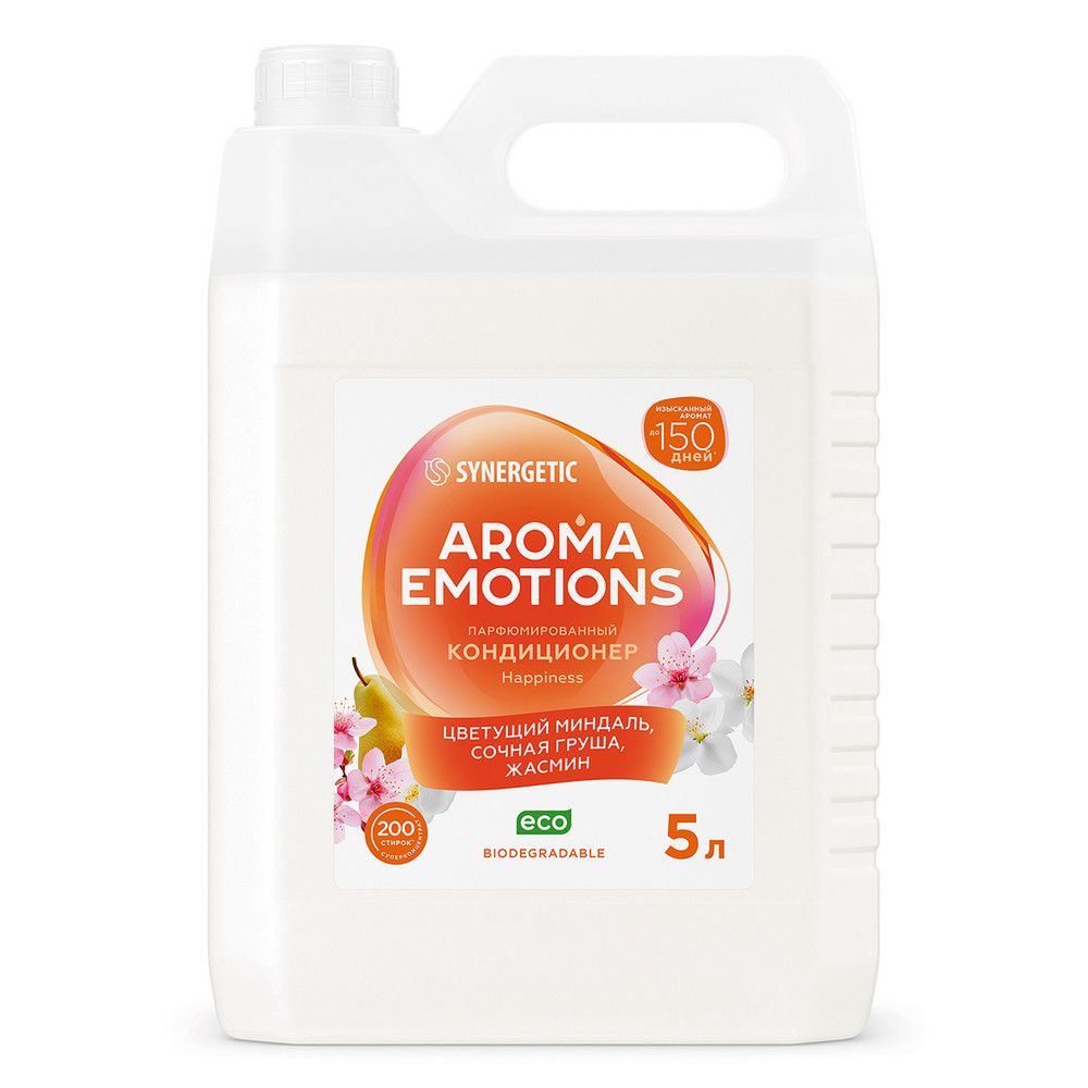 Биоразлагаемый кондиционер для белья SYNERGETIC "EMOTIONS" Happiness / Счастье – это не просто средство для ухода за тканью, это путешествие в мир ароматов, возможность выразить свою индивидуальность и добавить немного роскоши в повседневную жизнь. Кондиционер бережно ухаживает за всеми типами ткани, придаёт мягкость белью после стирки, обеспечивает лёгкую глажку. Обладает антистатическим эффектом. Суперконцентрированная формула обеспечивает экономичный расход средства. Биоэнзим целлюлаза препятствует появлению катышков и ворсинок, сохраняет первоначальный внешний вид и цвет ткани даже после многократных стирок, не разрушая её структуру. Растительный биолипид в составе кондиционера снижает риск возникновения раздражения кожи и способствует восстановлению её липидного слоя. Парфюмерная композиция Happiness представляет собой баланс между цветочно-фруктовой свежестью и теплотой древесных и мускусных акцентов. Открывается аромат сочными нотами спелой груши. Сердце его наполнено чувственными нотами иланг-иланга, обворожительного жасмина и нежного цветущего миндаля, которые словно окутывают атмосферой цветущих садов. Финальные аккорды принадлежат тёплым и глубоким нотам мускуса и кедра. Мускус придаёт аромату таинственность, а вечнозелёный кедр завершает композицию мягкими древесно-дымными нотами, даря ощущение уверенности и гармонии. Аромат, наполненный цветочно-фруктовой свежестью, завораживает и улучшает настроение, оставляя на ткани приятный шлейф до 150 дней при хранении белья благодаря инкапсулированной парфюмерной композиции. Кондиционер подходит для стирки всех типов тканей в стиральных машинах любого вида и для ручной стирки, для бытового и профессионального использования на предприятиях торговли, общественного питания, в гостиницах и в жилищно-коммунальном хозяйстве, в детских дошкольных и школьных учреждениях, а также учреждениях здравоохранения. Биоразлагаемые компоненты не вредят микрофлоре септических установок при использовании средства в соответствии со способом применения.