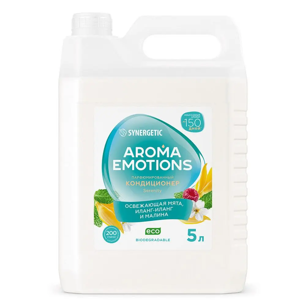 Биоразлагаемый кондиционер для белья SYNERGETIC "EMOTIONS" Serenity / Безмятежность – это не просто средство для ухода за тканью, это путешествие в мир ароматов, возможность выразить свою индивидуальность и добавить немного роскоши в повседневную жизнь. Кондиционер бережно ухаживает за всеми типами ткани, придаёт мягкость белью после стирки, обеспечивает лёгкую глажку. Обладает антистатическим эффектом. Суперконцентрированная формула обеспечивает экономичный расход средства. Биоэнзим целлюлаза препятствует появлению катышков и ворсинок, сохраняет первоначальный внешний вид и цвет ткани даже после многократных стирок, не разрушая её структуру. Растительный биолипид в составе кондиционера снижает риск возникновения раздражения кожи и способствует восстановлению её липидного слоя. Парфюмерная композиция Serenity, словно сочный фруктовый коктейль, с первых аккордов задаёт восхитительное игривое звучание. Открывается аромат освежающей комбинацией бергамота и свежей зелени, которая мгновенно поднимает настроение и заряжает энергией. В сердце аромата — экзотический иланг-иланг, сочная малина и бодрящая мята. Малина привносит сладкие ягодные акценты, а мята дарит приятную прохладу, прозрачность и свежесть. Завершают композицию ненавязчивые ноты мускуса и амбры, которые придают аромату мягкость, шелковистость и длительное и приятное послевкусие. Привлекательный свежий и чистый фужерный аромат завораживает и улучшает настроение, оставляя на ткани приятный шлейф до 150 дней при хранении белья благодаря инкапсулированной парфюмерной композиции. Кондиционер подходит для стирки всех типов тканей в стиральных машинах любого вида и для ручной стирки, для бытового и профессионального использования на предприятиях торговли, общественного питания, в гостиницах и в жилищно-коммунальном хозяйстве, в детских дошкольных и школьных учреждениях, а также учреждениях здравоохранения. Биоразлагаемые компоненты не вредят микрофлоре септических установок при использовании средства в соответствии со способом применения.
