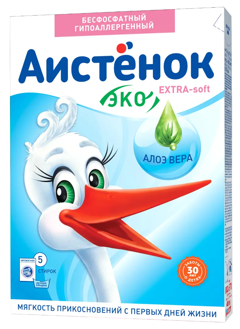 С любовью и заботой мы предлагаем вам "АИСТЕНОК" – EXTRA–soft для стирки белья не только детей, но и взрослых с чувствительной кожей, который содержит природный кондиционер - экстракт АЛОЭ ВЕРА и новую систему удаления пятен, обеспечивающих еще более мягкое воздействие на ткань, придавая ощущение нежности при соприкосновении с чувствительной кожей.