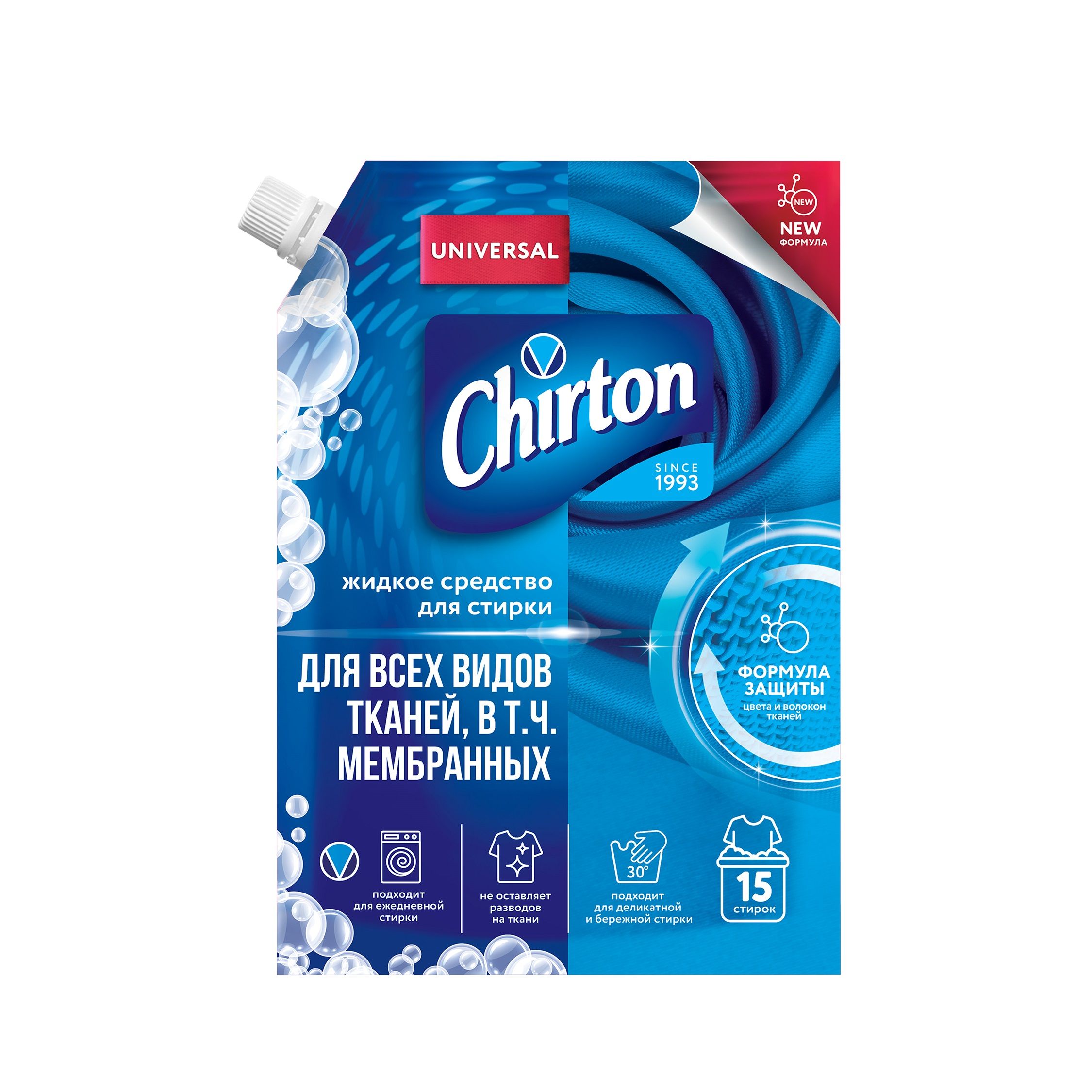 Жидкие средства для стирки Chirton помещены в современную упаковку дой-пак, что делает их удобными при покупке и надёжными в хранении (не рассыпаются, не намокают).· Легко и удобно дозируются, экономный расход.· Бережное воздействие на ткани.· Актуально для людей с чувствительной кожей.· Хорошо растворяются в воде, легко выполаскиваются.