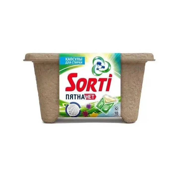 Капсулы для стирки Sorti борются с различными видами загрязнений, быстро растворяются и отлично выполаскиваются с любых вещей, освежая их и сохраняя яркий цвет. Упаковка из пульпированного картона защищает капсулы от намокания при повышенной влажности и не требует специальной утилизации. Новое решение экологичной жизни.