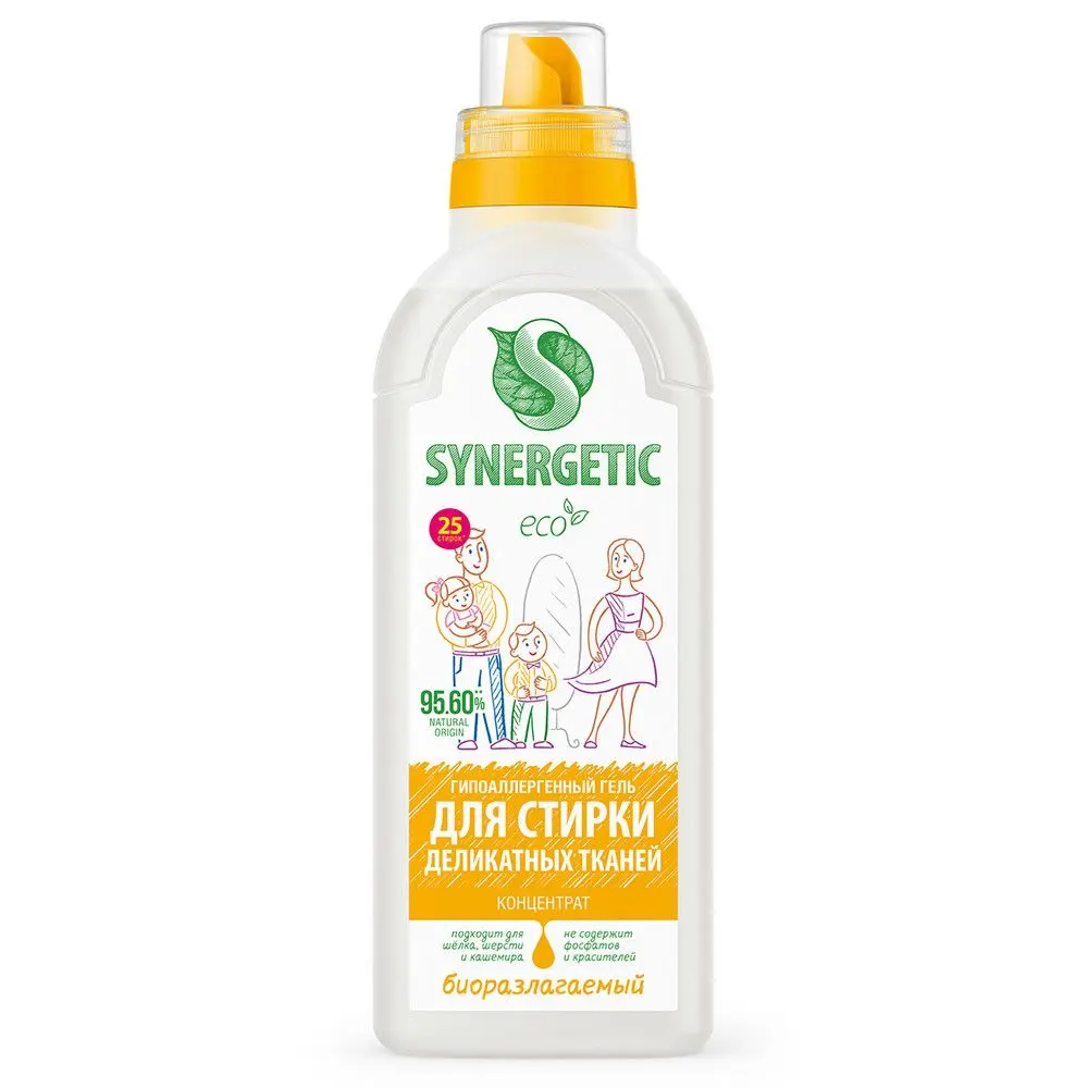 Биоразлагаемый концентрированный гель для стирки деликатных тканей SYNERGETIC предназначен для стирки деликатных тканей в стиральных машинах любого типа и ручной стирки при температуре 20-40 °C. Уникальный комплекс растительных тензидов и зеленых хелатов обеспечивает бережное и эффективное очищение деликатных тканей: шерсти, шелка, кашемира и других. Функциональные добавки предотвращают повторное оседание загрязнений на ткани, сохраняя ее первоначальный вид, прочность и структуру. Гипоаллергенная парфюмерная композиция с эфирными маслами лаванды, бергамота и шалфея оставляет легкий и приятный аромат. Биоразлагаемый гель безопасен для природы и человека, не содержит красителей, фосфатов, фосфонатов, ЭДТА и агрессивных ПАВ. Средство легко выполаскивается из тканей и имеет близкий к нейтральному уровень pH. Биоразлагаемые компоненты не вредят микрофлоре септических установок при использовании средства в соответствии со способом применения.