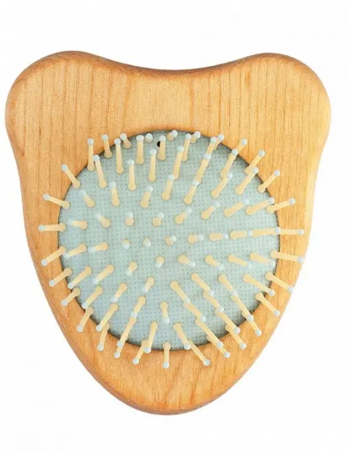 Деревянная расчёска с мягкими пластиковыми зубчиками и цветной подушкой.Необычная форма удобно ложится в ладонь, выглядит красиво и эффектно, привлекает внимание. Расчёска практически невесомая благодаря корпусу из натурального дерева, поверхность гладкая и приятная на ощупь.