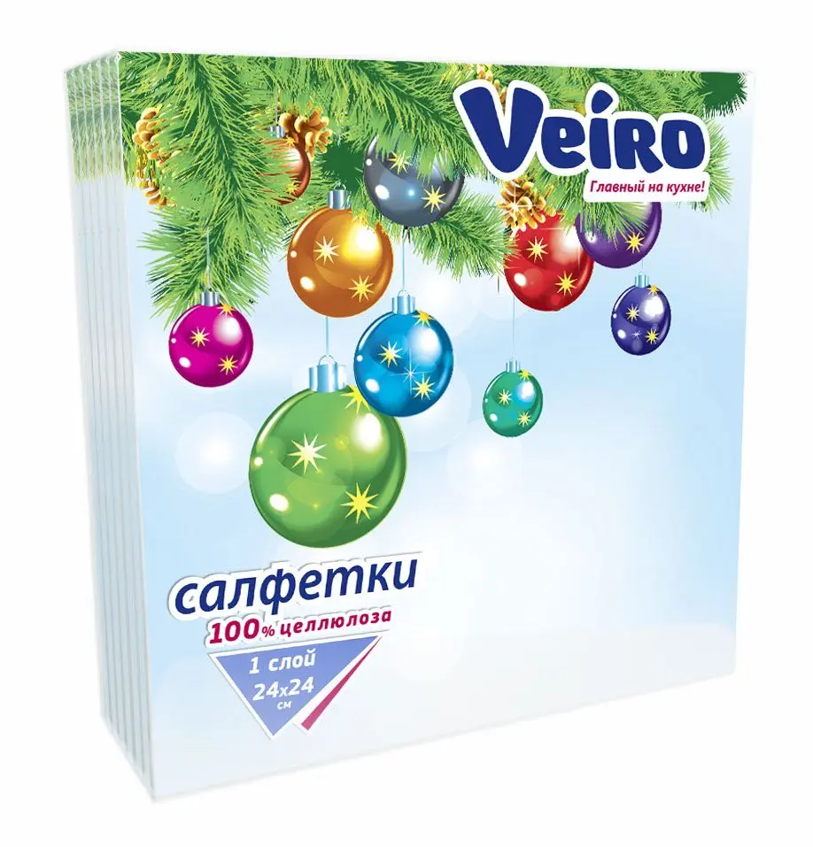 Салфетки сервировочные размером 33*33мм трёхслойные ТМ VEIRO с многокрасочным рисунком Ветка с шарами, изготовлены из 100% целлюлозы согласно ГОСТ Р 52354-2005