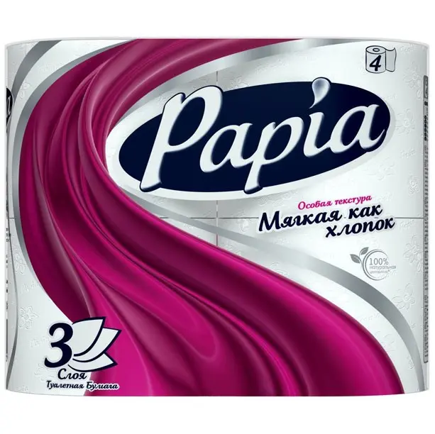 Для тех, кто ищет идеальную белизну – белая трехслойная туалетная бумага Papia. Туалетная бумага изготовлена из 100% целлюлозы.