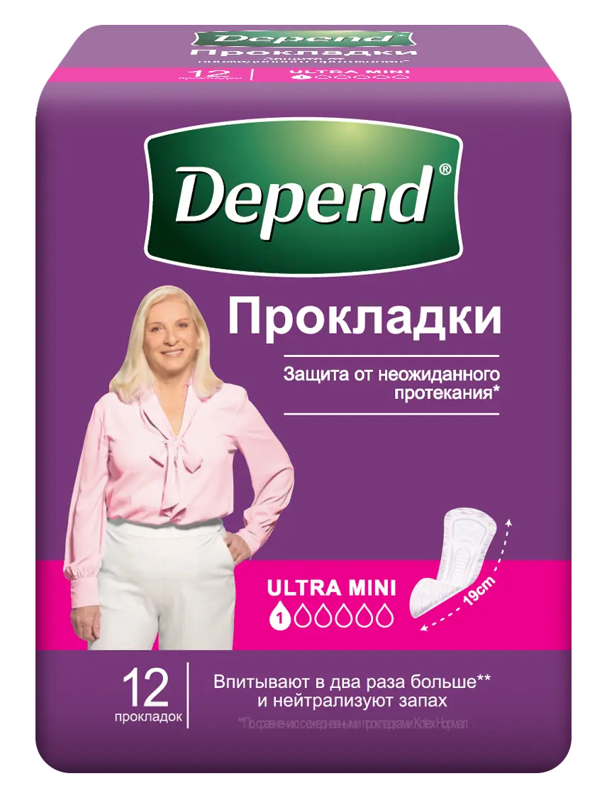 Урологические прокладки Depend Ultra Mini Защита, обеспечивающая свободу движения 12 штук Специально разработанные прокладки Active-Fit (Эктив Фит) помогают обеспечить незаметную и комфортную защиту даже когда вы активны. Благодаря инновационному дизайну и современным технологиям они тонкие и гибкие, как ежедневные прокладки, и такие же невидимые для окружающих. Ультратонкий впитывающий центр FlexLoc (Флекс Лок) - это уникальное сочетание впитывающего слоя и нетканной перфорированной поверхности с желобками. Благодаря объемному рельефу прокладки жидкость быстро и равномерно впитывается, нежелательный запах удерживается, оставляя ощущение сухости, а мягкая и приятная на ощупь поверхность обеспечивает комфорт в использовании и свободу в движении.
