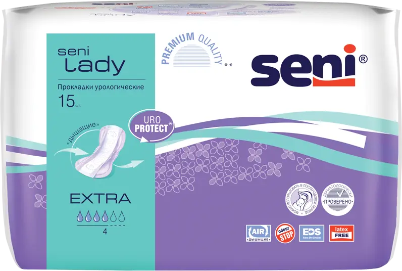 Анатомическая форма урологических прокладок Seni Lady помогает оптимально прилегать к телу, быть незаметными под одеждой, обеспечивает надежную защиту. «Дышащие» гигиенические прокладки изготовлены для представительниц прекрасного пола, ведущих активный образ жизни, ценящих комфорт и удобство. Широкий размерный ряд (семь видов размеров) дает возможность выбрать каждой согласно своим потребностям. Имеют широкую полосу для надежного крепления к белью. Нейтрализуют неприятные запахи, обладают высокой поглощающей способностью. Впитывающий слой урологических прокладок Seni Lady содержит антибактериальный абсорбент.