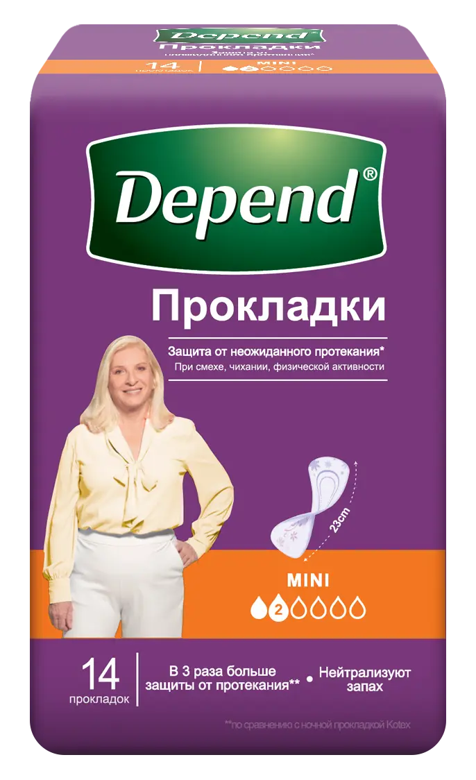 Прокладки для женщин Depend Mini, 14 шт. Прокладки Депенд Mini созданы специально для защиты при выделении мочи у женщин. Удлиненные прокладки без крылышек Depend Ultra Mini оснащены технологией 4 в 1, что обеспечивает надежную защиту и контроль.