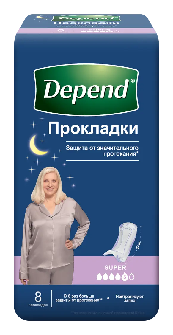 Урологические прокладки Depend Super для женщин, 8 шт. Новые прокладки Depend Super созданы специально для защиты при высокой степени недержания. Технология 4 в 1. Надежная защита и контроль.