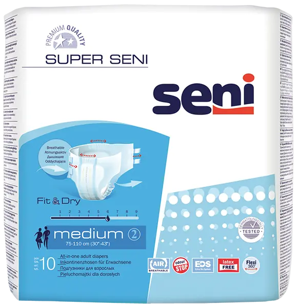 Подгузники Super Seni помогут деликатно и гарантированно решить проблемы, возникающие при энурезе. Предназначаются и для людей с ограниченными возможностями и для активных людей. Имеют гидрофобные боковые бортики, которые расположены внутри и создают дополнительную защиту от протекания. Подгузник снабжен индикатором влагонасыщения, помогающим вовремя определить наступление времени смены изделия. Сдавливания в области пояса помогает избежать эластичная резинка, которая обеспечивает комфортное прилегание к телу человека. В состав подгузников Super Seni входит дополнительный сдвоенный впитывающий слой, содержащий абсорбент высокого качества с антибактериальными свойствами. Он поможет избежать появления неприятных запахов и повысить уровень впитывания. Также по боковым сторонам подгузника расположены двойные эластичные липучки-застежки, позволяющие расстегивать и застегивать подгузник, не рискуя разорвать его внешний слой.
